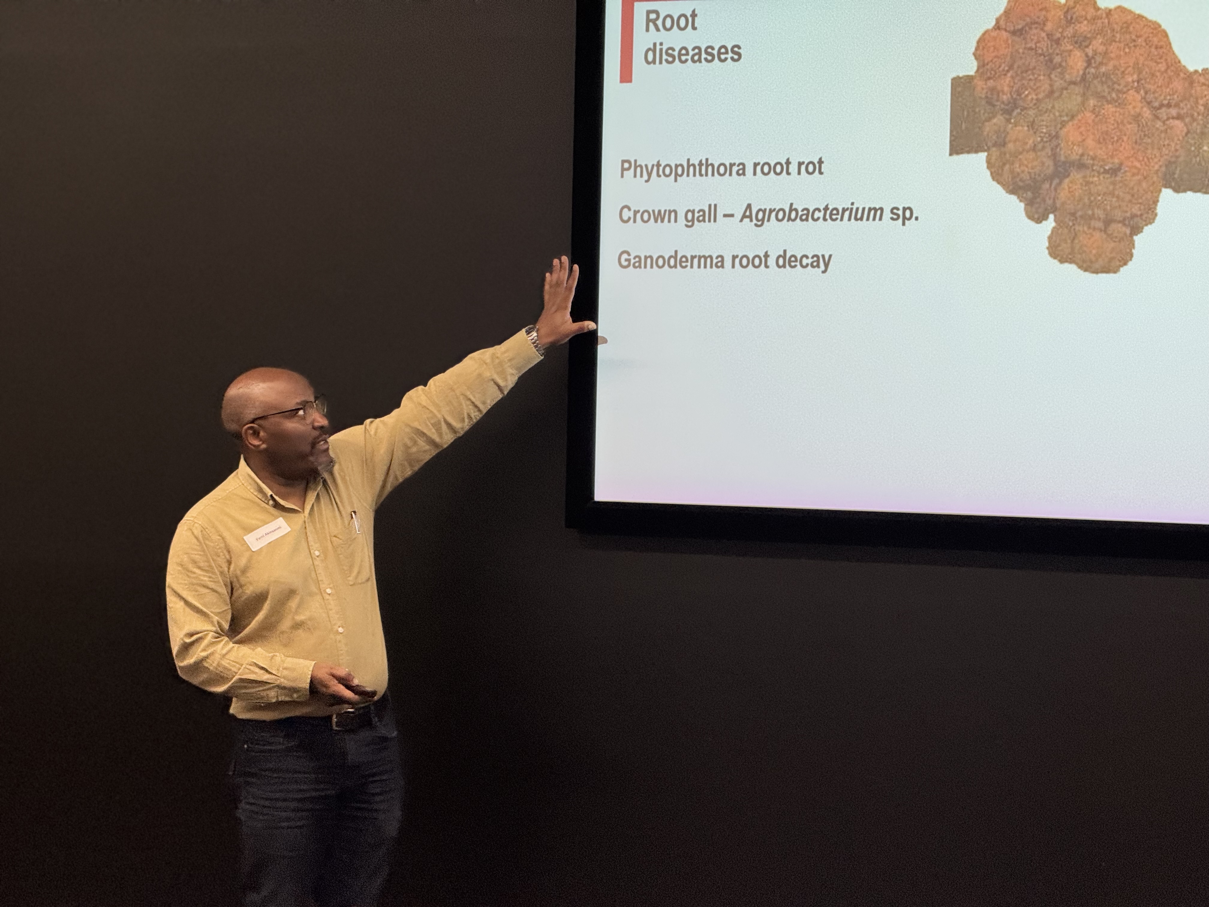 Dr Femi Akinsanmi (UQ QAAFI) led a practical session on disease diagnostics and orchard hygiene, focusing on how early detection, prevention and proactive management can reduce yield losses and improve long-term orchard resilience.