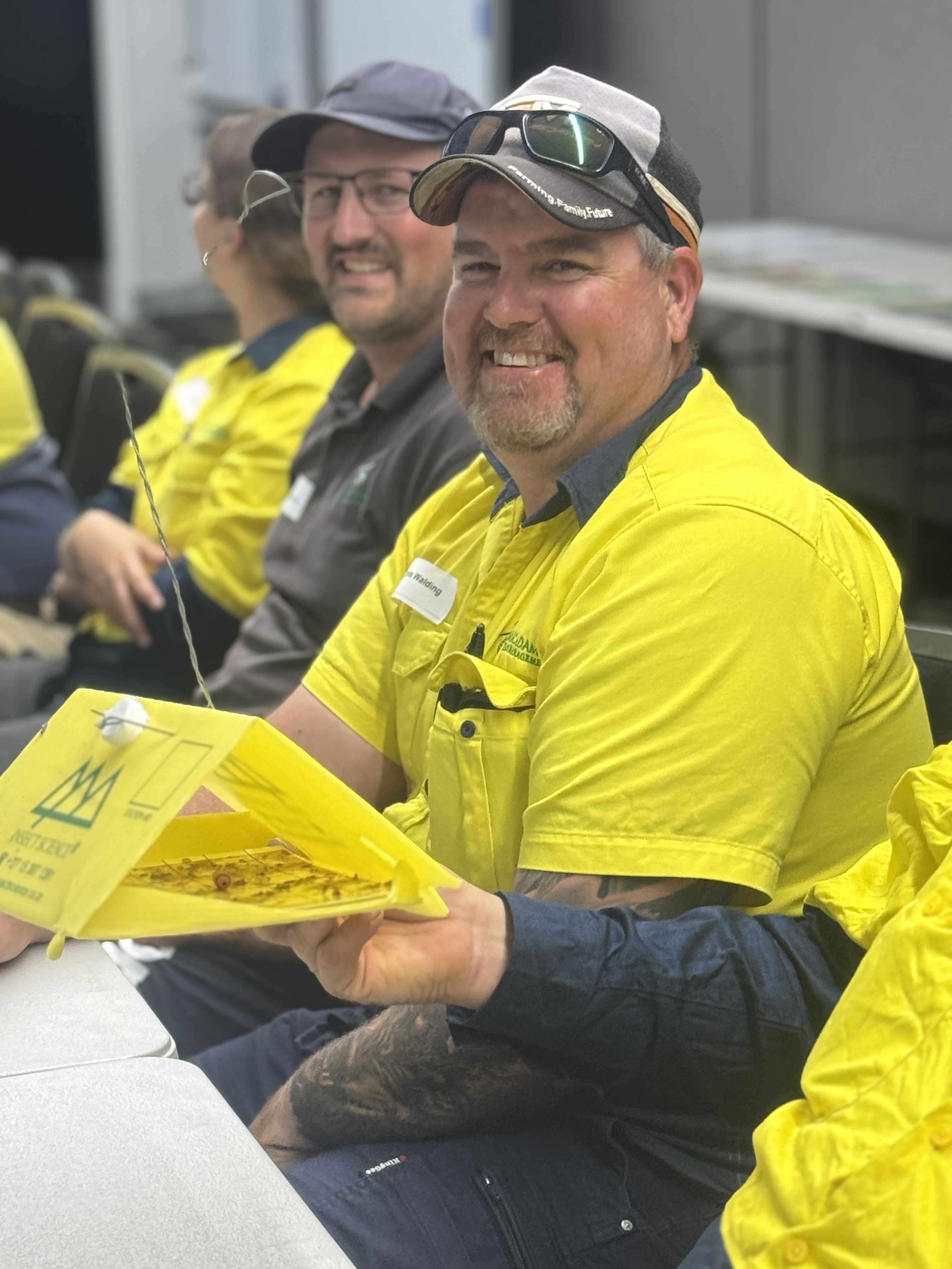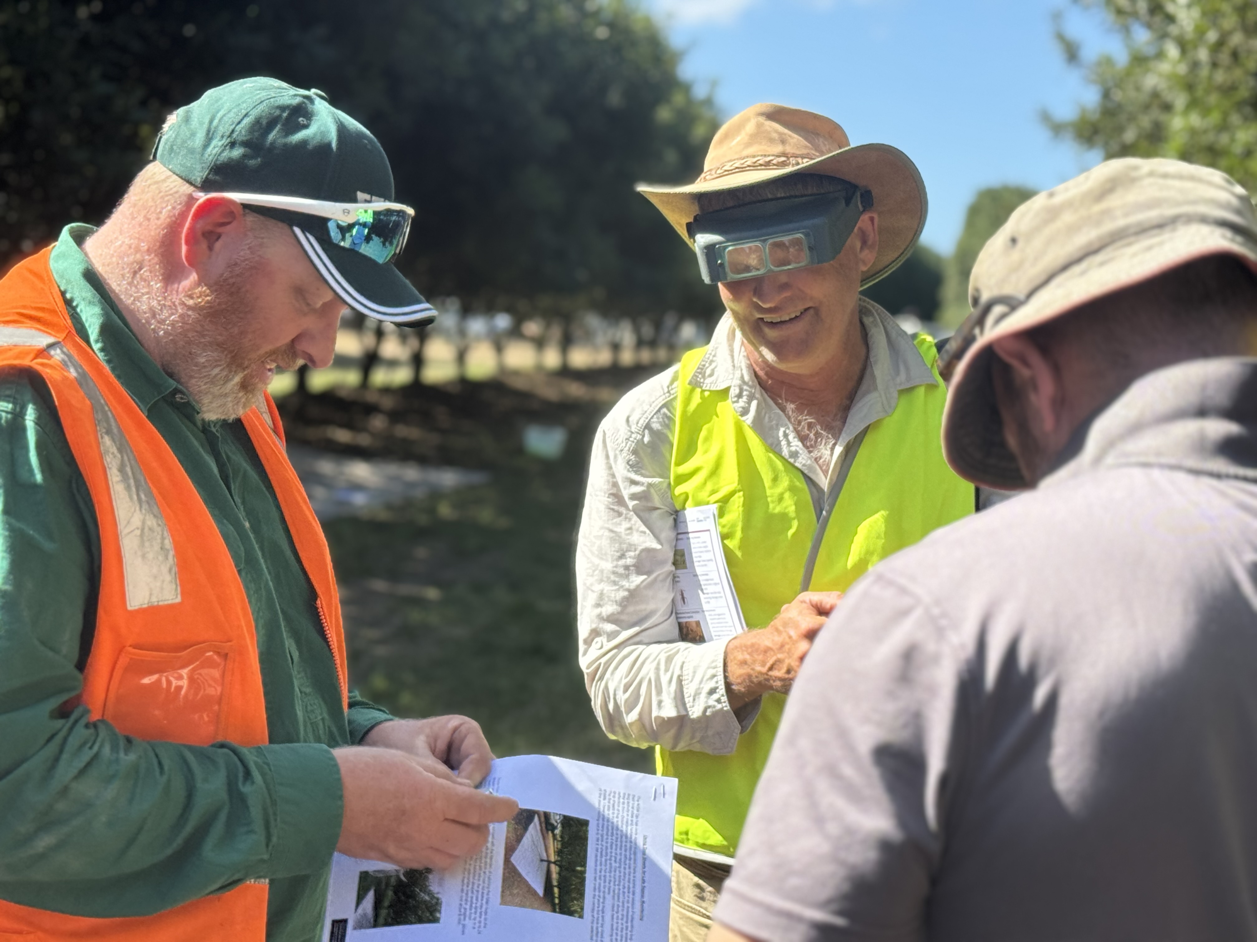 Craig Maddox and Saleh Adnan (NSW DPIRD) discussed the key pest species across regions, highlighting the importance of accurate monitoring, correct identification and timely responses to protect yield and orchard health. Chris Fuller (Nutworks) and Chris Themsen (Agreco) demonstrated monitoring techniques and explained how balanced integrated pest management (IPM) programs support beneficial insects and overall orchard balance.