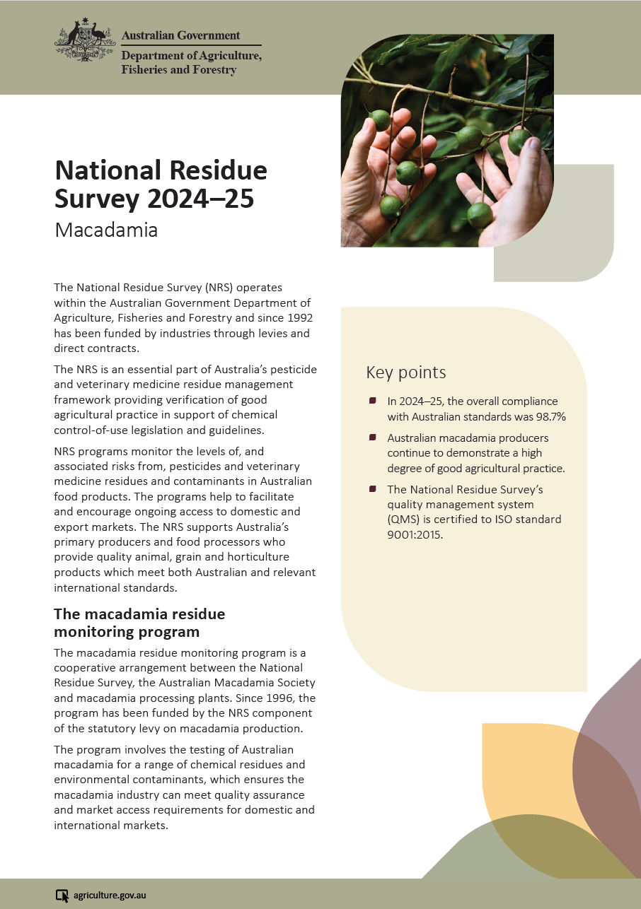 An operational unit within the Australian Government Department of Agriculture and Water Resources, the NRS tests Australian macadamias for a range of chemical residues and environmental contaminants, ensuring the macadamia industry is meeting the quality assurance and food standard requirements for both domestic and international markets.