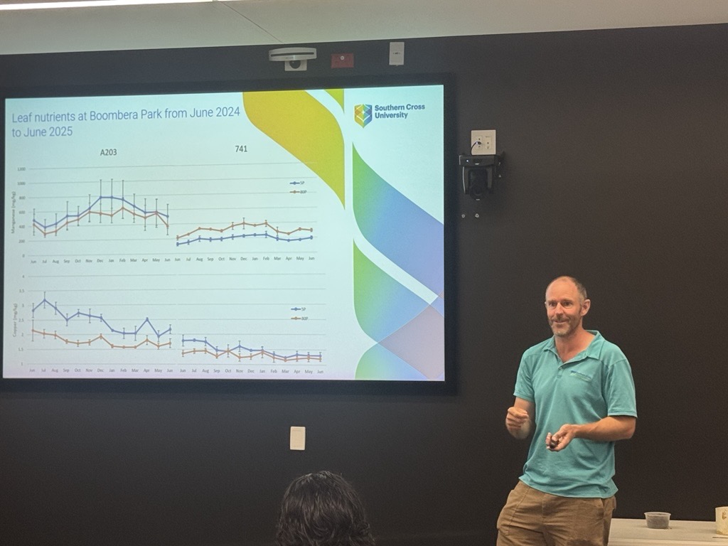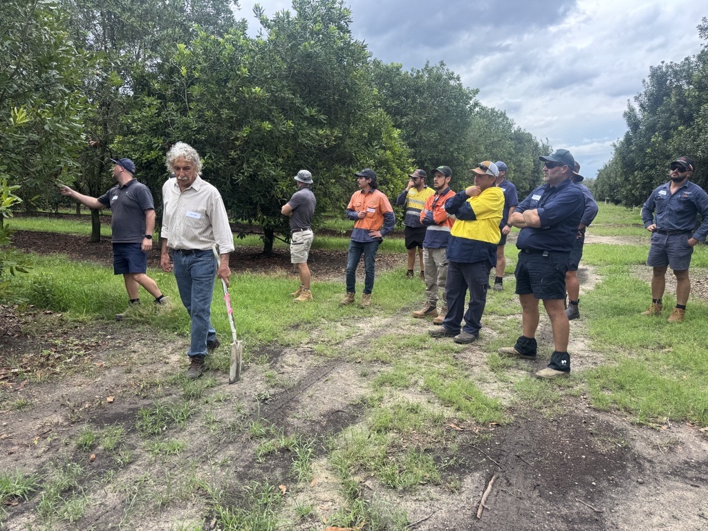 Alan Coates (Coates Horticulture) opened the workshop with a deep dive into soil health, highlighting how soil structure and biology work together below the surface to drive strong, resilient trees. Terry Rose (Southern Cross University) followed with the latest phosphorus research, helping growers refine nutrient programs by identifying the lowest effective P levels for high yield and improved environmental outcomes.